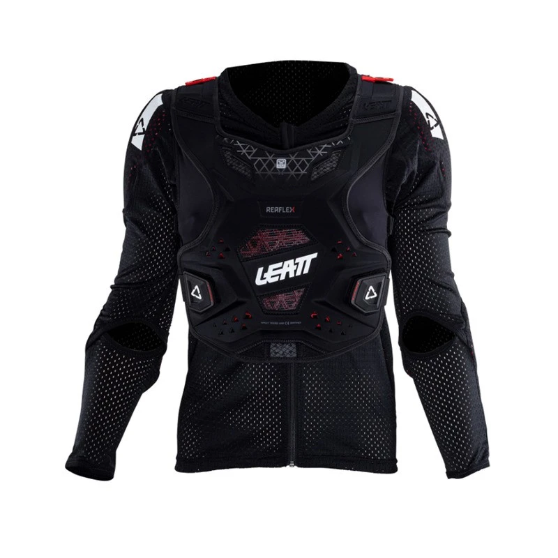 Koszulka posiada pełnej długości zamek dla łatwego dopasowania, a ochraniacz na klatkę piersiową i plecy można używać z ochraniaczem na szyję Leatt lub bez niego.